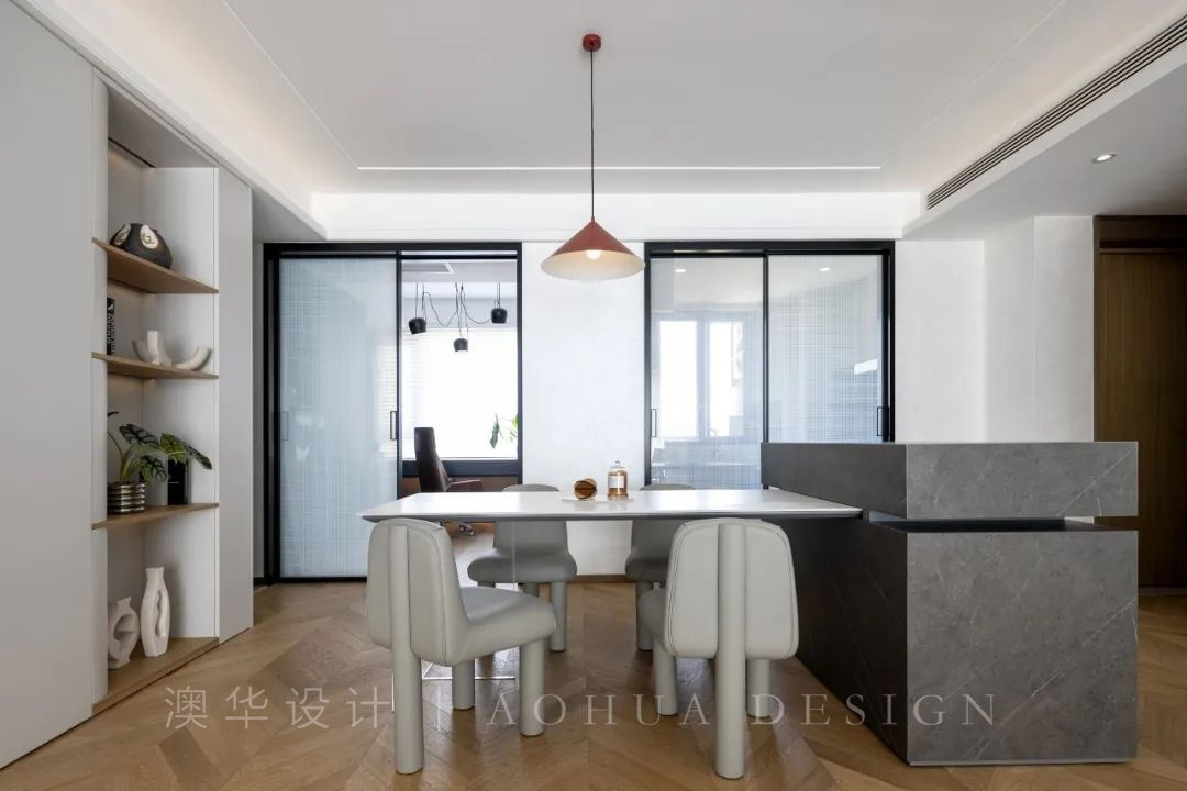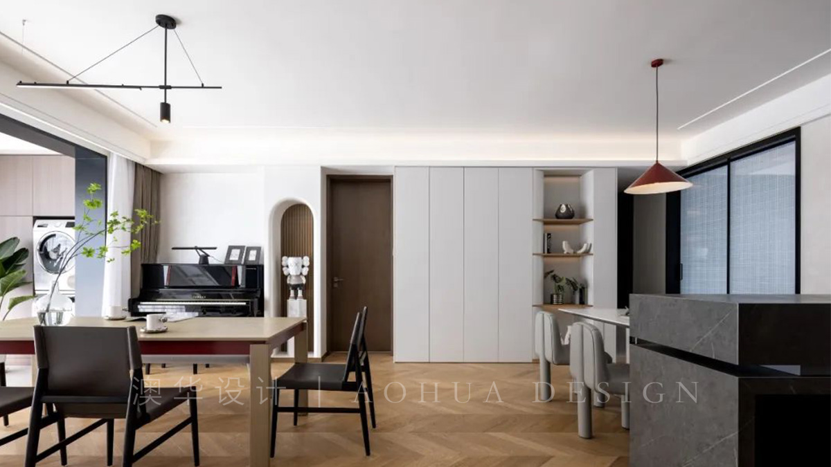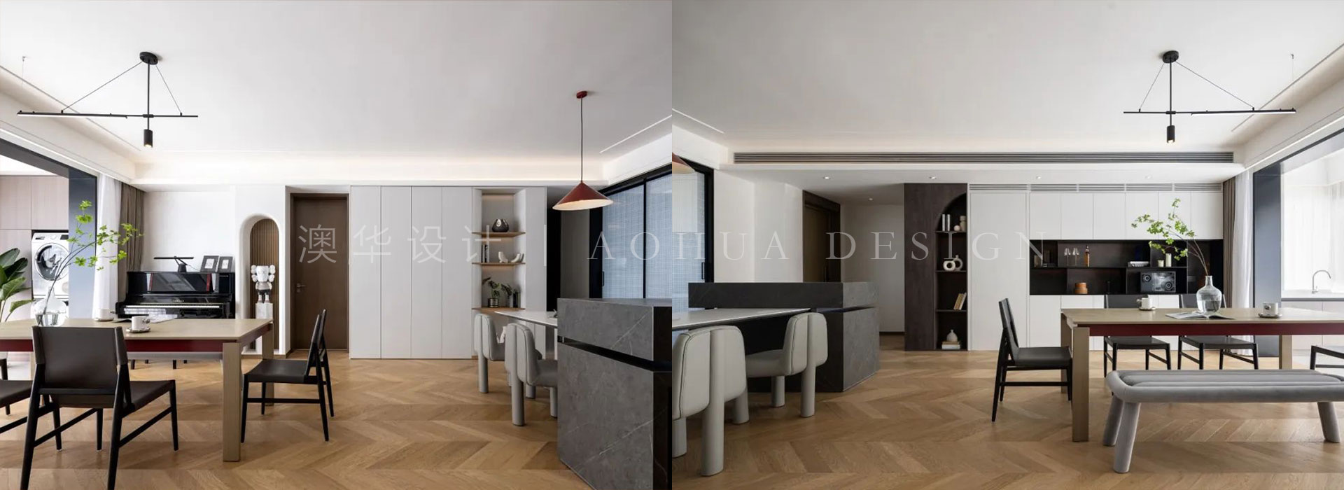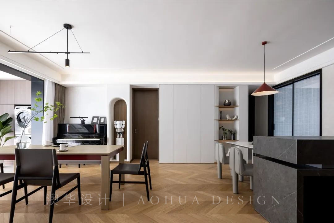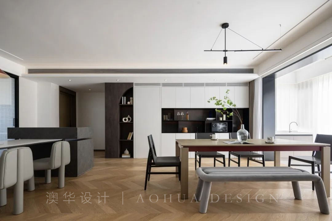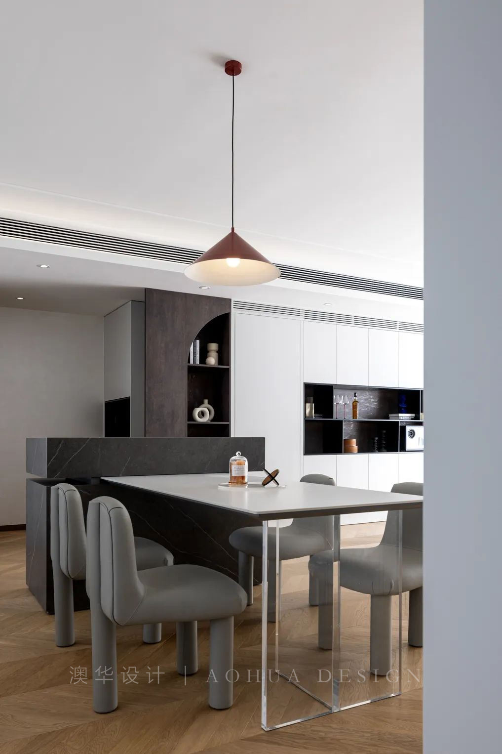 • 黑灰紋路大理石餐臺,漆紋木質地板,搭襯簡易明色的定制桌椅,無不敘述著空間中的恬靜溫暖
