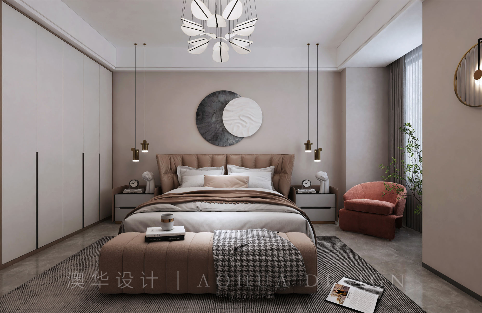 • 主臥以不同層次的焦糖色為主色調(diào),不迎合、不隨波逐流,以個(gè)性的姿態(tài)面對(duì)人生。墻面以質(zhì)樸有序的線條加上流動(dòng)律動(dòng)的金線工藝裝飾,極富韻律,給人松弛平靜之感。在承重與輕盈的最大化平衡中,帶來(lái)無(wú)限暢想與別樣情趣,搭配光影營(yíng)造簡(jiǎn)約利落的材質(zhì)感受。)