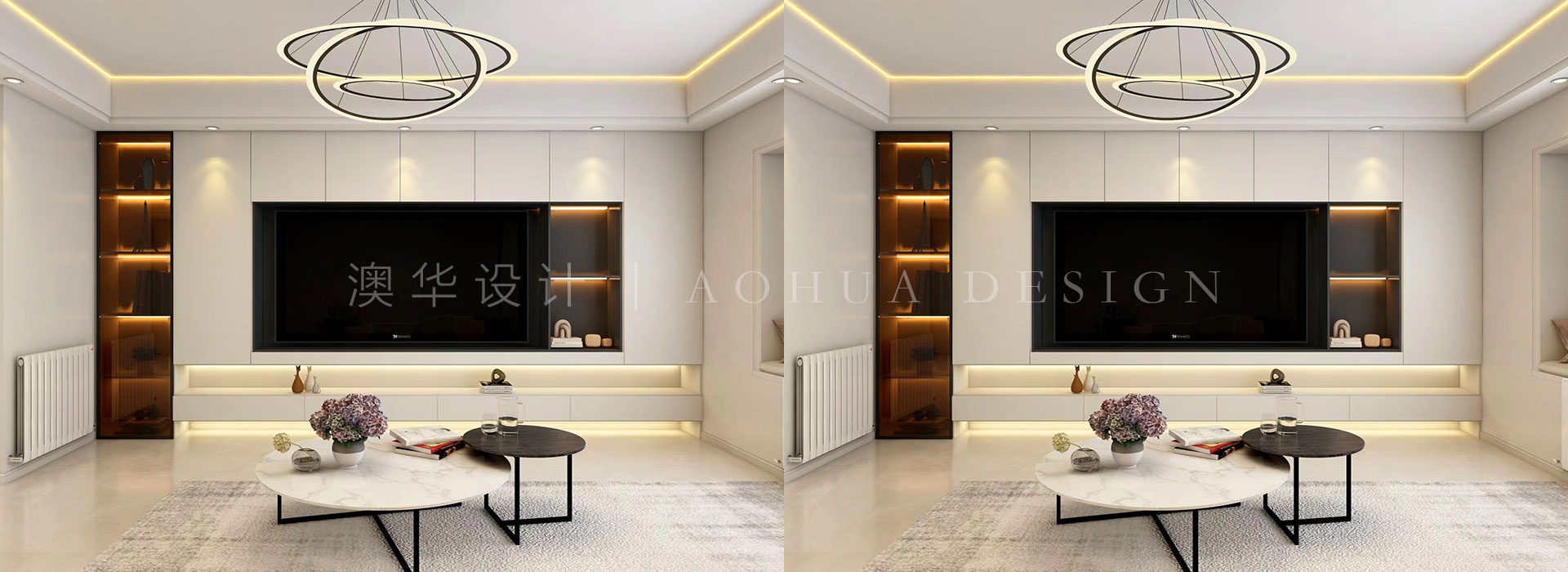 • 將原有的四房改為三房,在客廳增加更多的儲物功能,吧臺設計增加了辦公區域,增加了區域使用功能