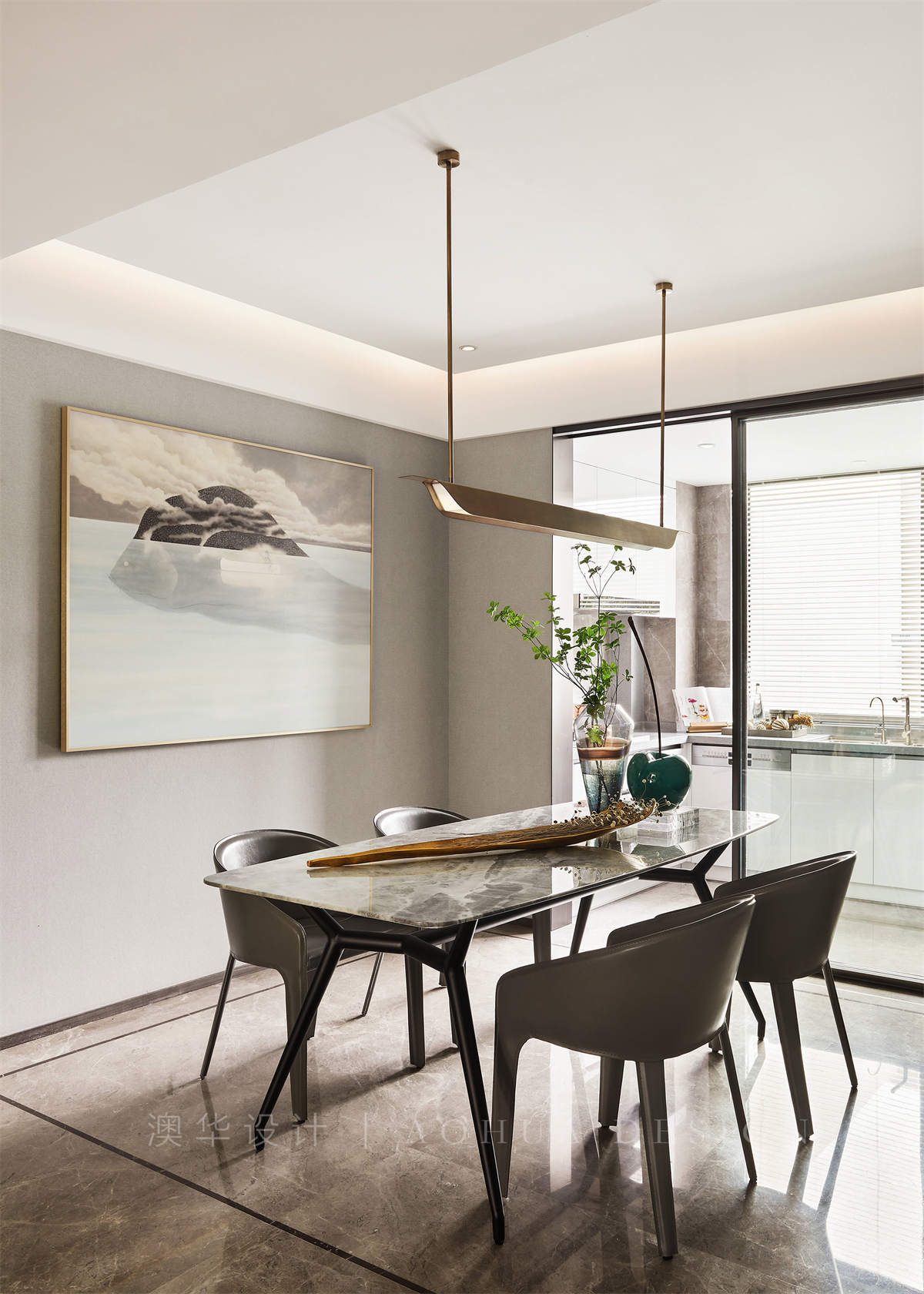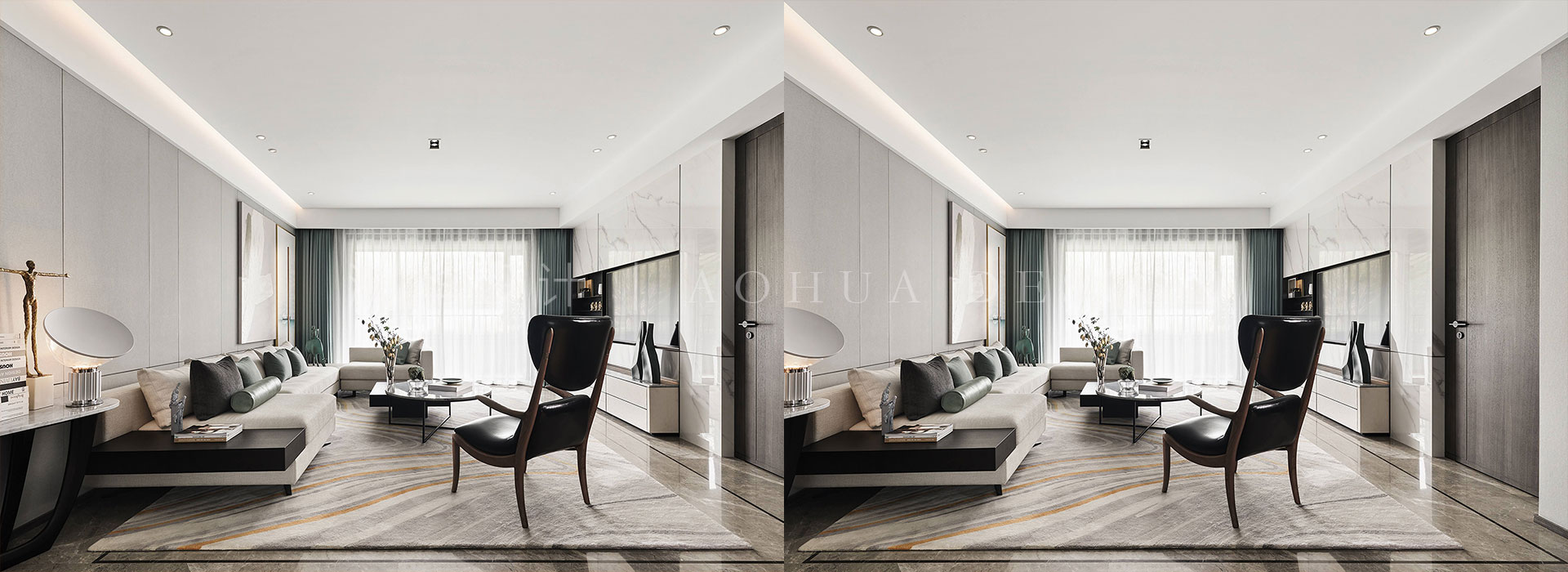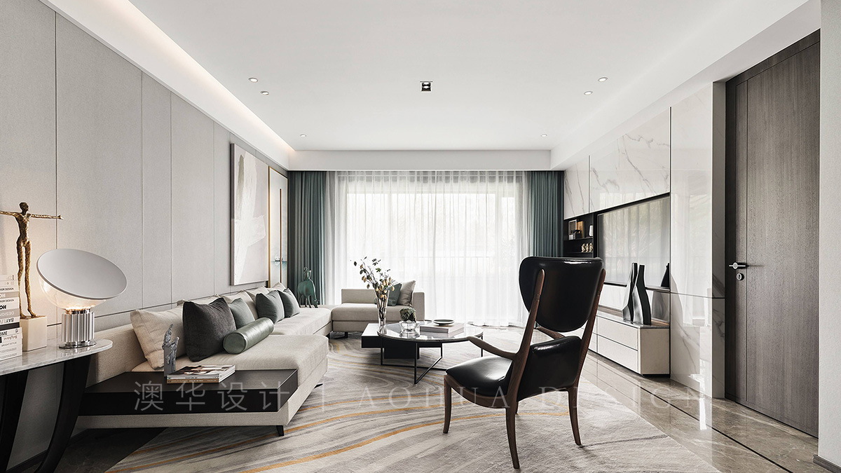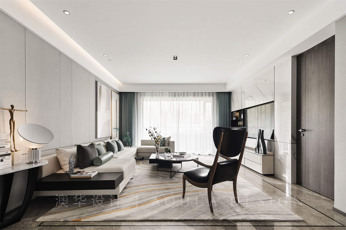 • 客廳空間在整體極簡和雅的氣質中,不同層次的青、白、灰色和諧相融;軟包、瓷板、皮料等現代風格材質,構塑空間高雅大氣的當代調性。錯落有序地展呈在各處的藝術品,選自沈勤、秦修平等新派藝術家,將無數主張與思想,容納在平靜的美學中,豐富空間的精神人文內涵。