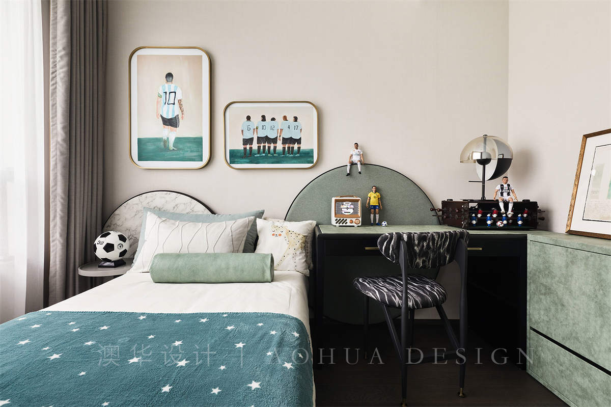 • 兒童房以“筑夢童樂星球”為主題搭建孩童玩趣十足的生活空間,藍色的星辰、漂浮的太空人、充滿科技感的玩偶……設計以細膩的手法還原天真爛漫的童年時光。