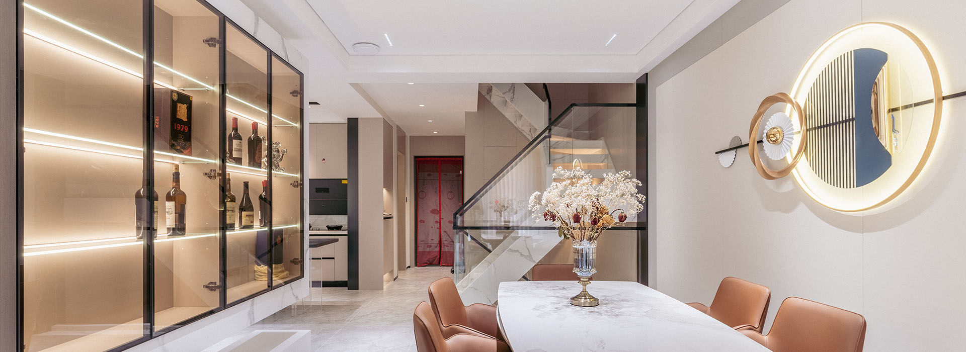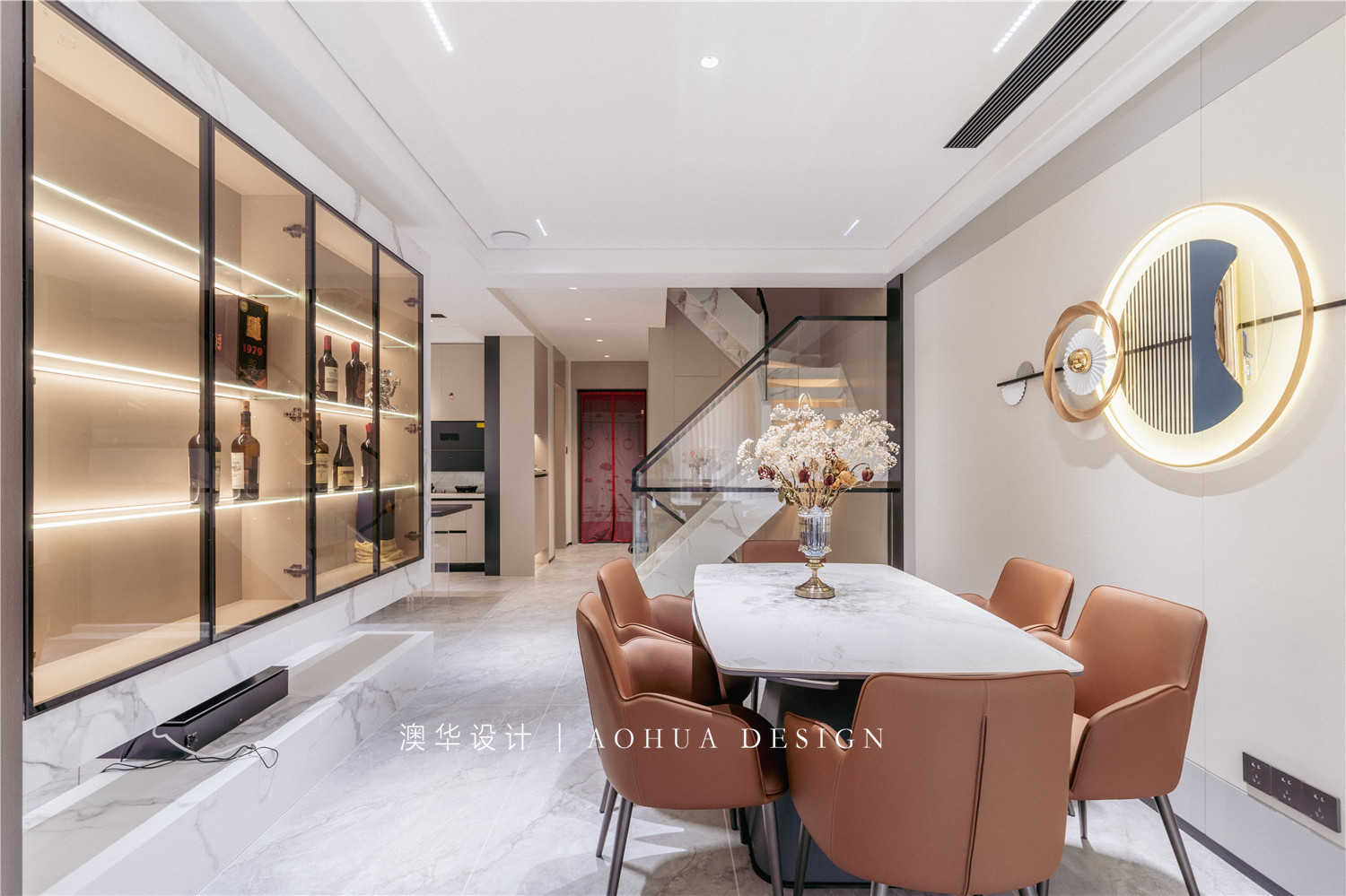 • 餐廳與客廳隔而不斷,懸浮電視背景墻的背后,巧妙定制一排格調(diào)十足的酒柜,實(shí)現(xiàn)功能與藝術(shù)美學(xué)的完美融合,也區(qū)分了餐廳與客廳區(qū)域。