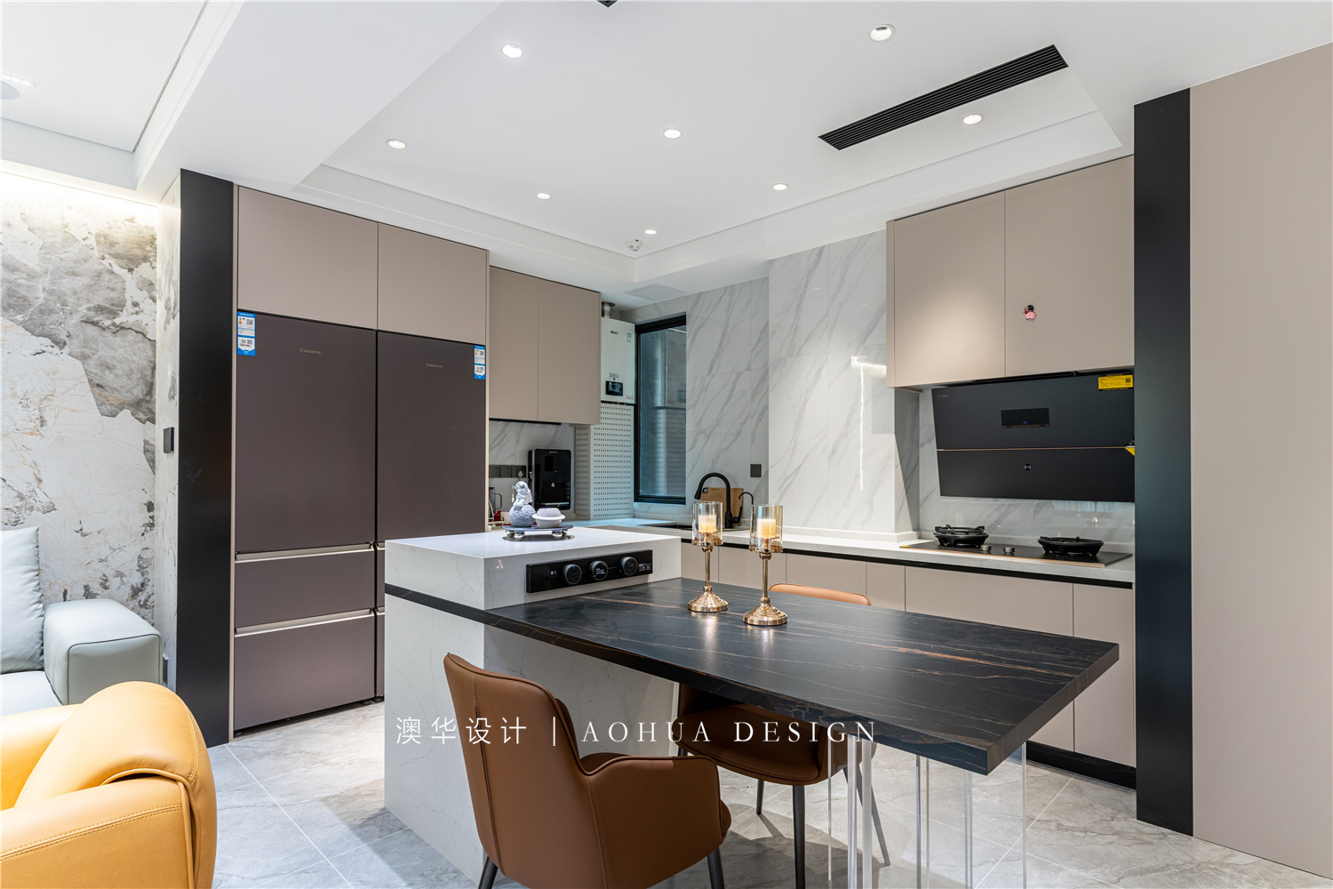 • 廚房與客廳之間沒有做硬性隔斷,開放式的布局讓空間更顯通透,搭配淡雅的空間基底,給人一種渾然天成的既視感,舒緩而雅致。
