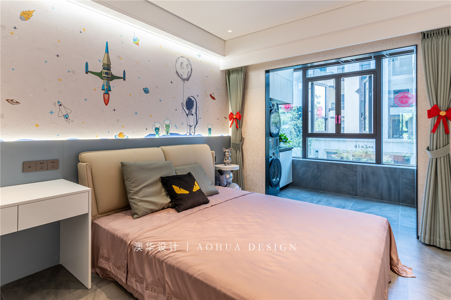 • 夢幻太空宇航員背景搭配同系列玩偶擺件,帶來童趣的主觀感受,有效減弱空間里的棱角與沉悶,塑造出有趣又迷人的成長環(huán)境。
