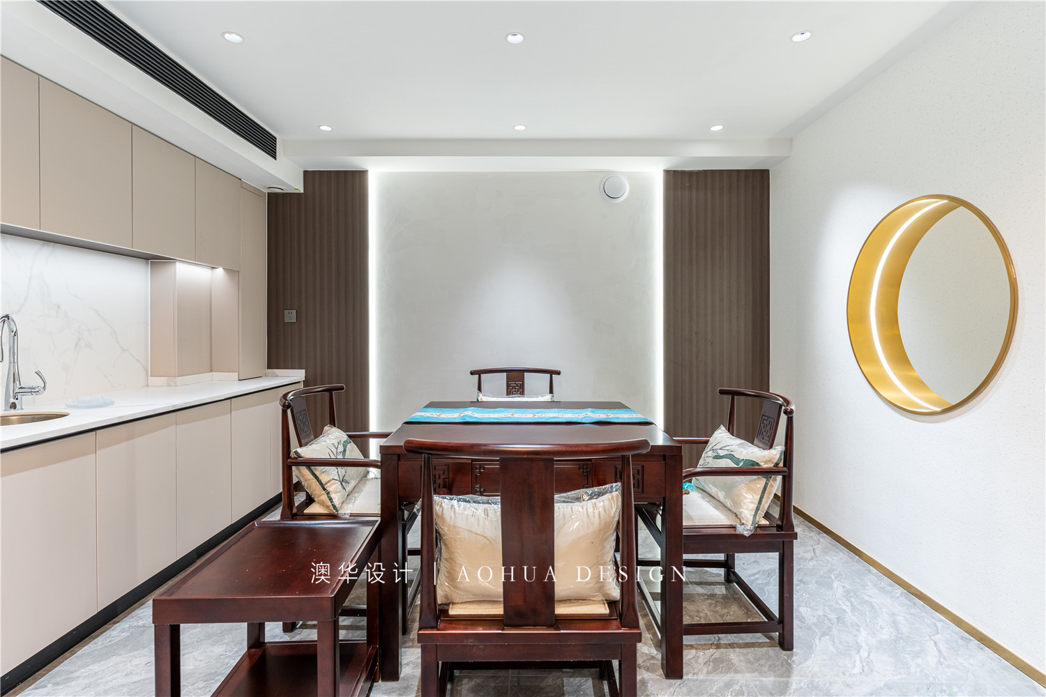 • 深原木色桌椅占據(jù)空間的中心位置,一桌兩用,既是麻將桌也是茶桌,搭配餐邊柜,解鎖多元場景需求,賦予業(yè)主更豐富的生活體驗(yàn)。