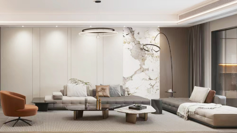 地磚采用水泥樣式地磚,將“肌理、自然、質感”充分體現,營造出的空靈之美,更是侘寂美感之本體。電視下面做一排懸空的電視柜。