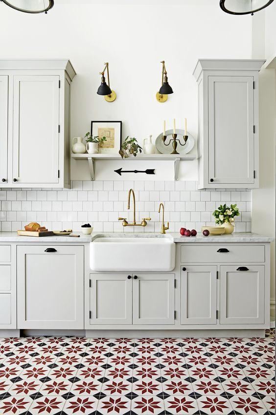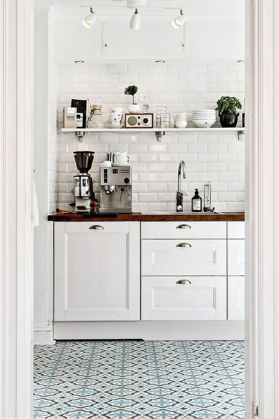 ? ? ? ?▲?清新感的小白磚上墻,復古風情的花紋磚鋪地,這兩種元素和諧地碰撞在一起,就能打造令人眼前一亮的廚房了。需注意的是同樣占據大面積的整體櫥柜,選擇簡約純色的款式就好,以免和花磚紋理相沖突,會使廚房整體看起來層次雜亂。