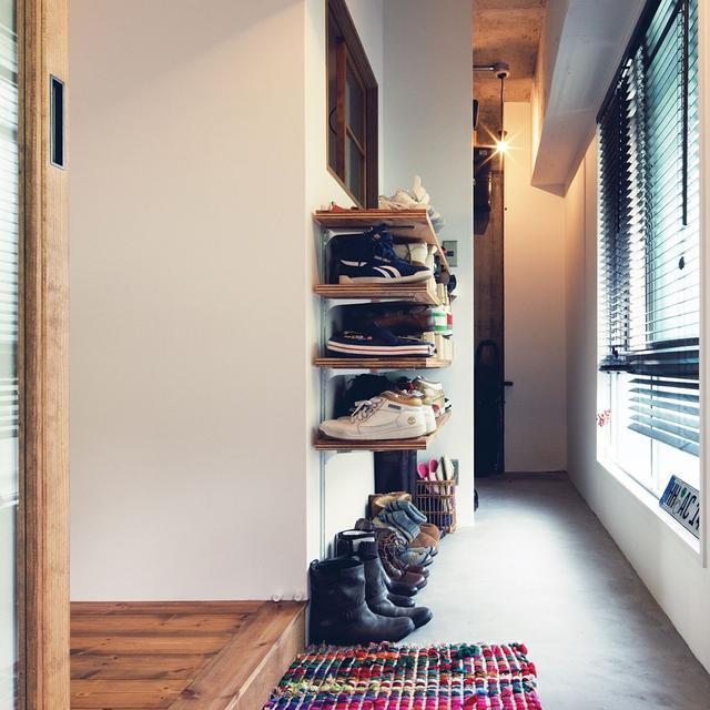 連做柜子的深度都沒有的玄關,只能用上擱板了。這個做法很值得借鑒。加上幾塊隔板,隔出間距,鞋柜的功能得到充分實現。