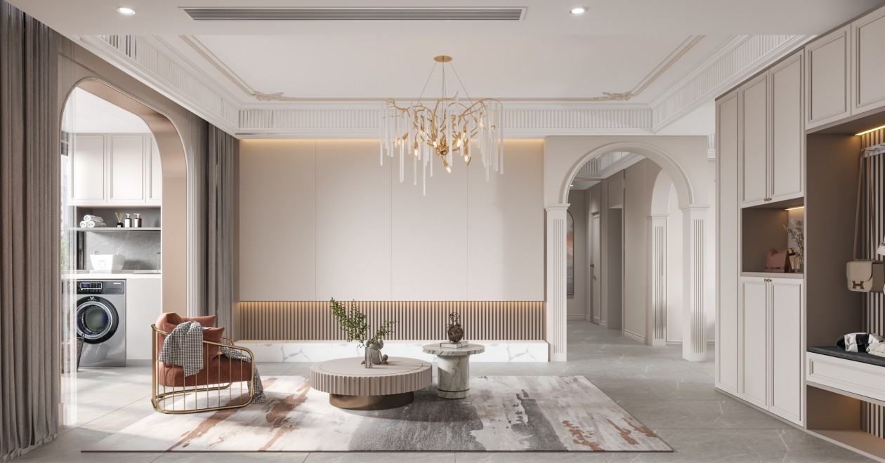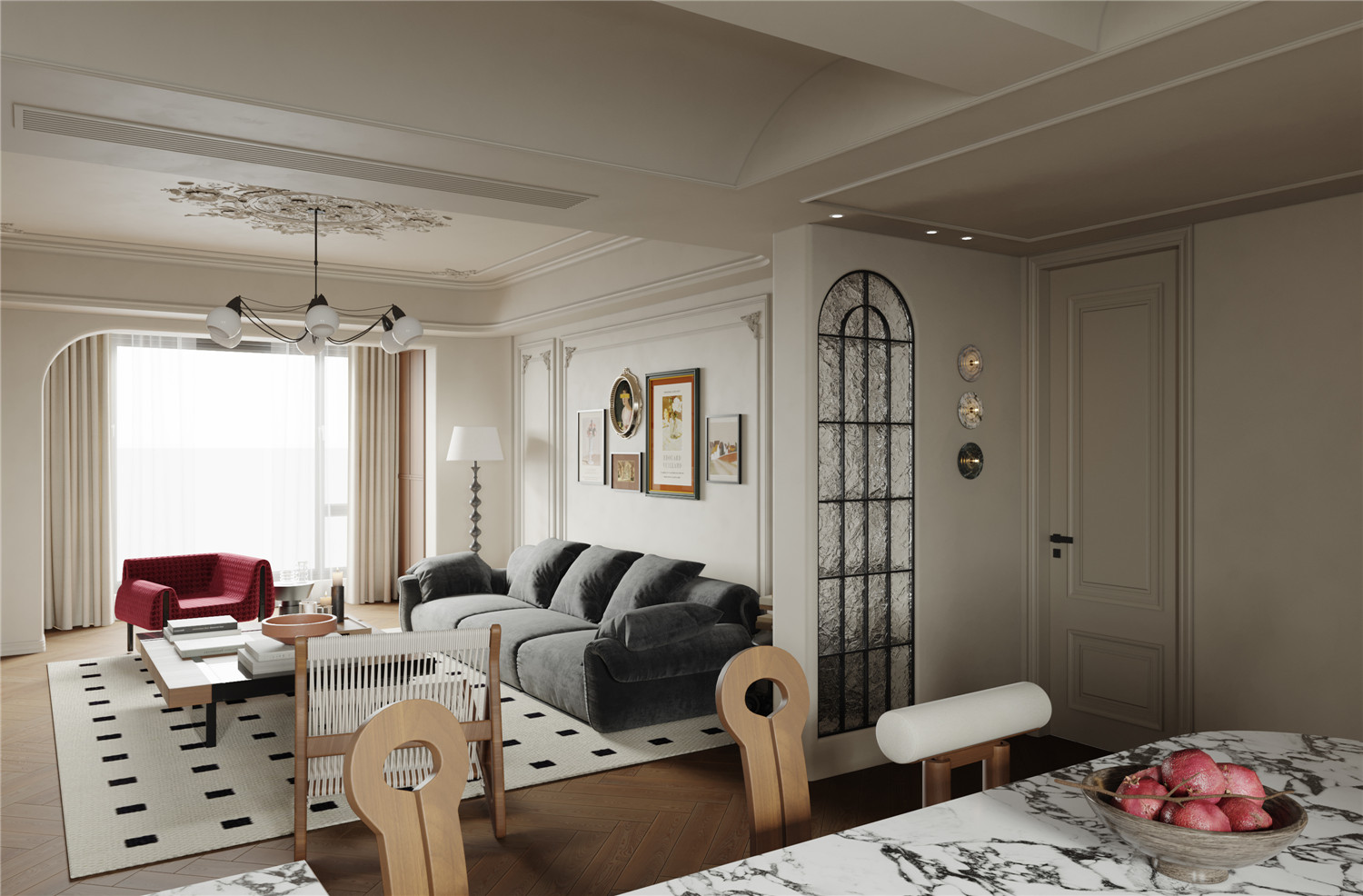 復地東湖國際這套170㎡的四居室住宅戶型相對比較平整方正,而由于入戶門在房屋偏角處,因此設計師在進行規(guī)劃設計時就利用入戶門軸向作一個劃分,將作伴區(qū)域作為業(yè)主的辦公、休憩區(qū)域、中間則設置為會客區(qū)域,右邊則打造為兒童房,有效提升了各個功能區(qū)域的劃分。