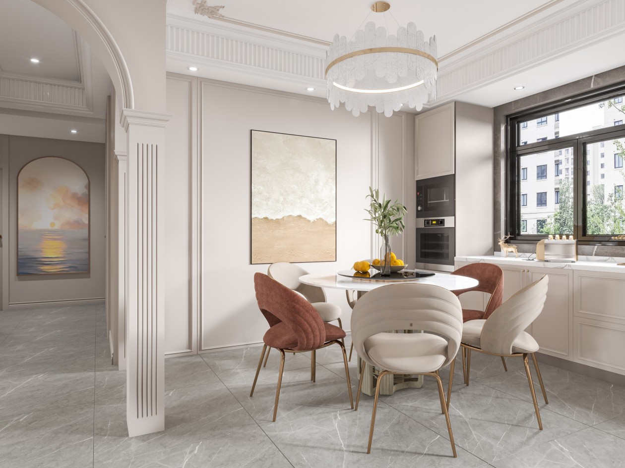 淡藍色的墻面為就餐區(qū)域增添了一抹清新明麗的氛圍,而造型優(yōu)雅的餐座椅則讓整個就餐區(qū)域多了一抹精致的浪漫感。