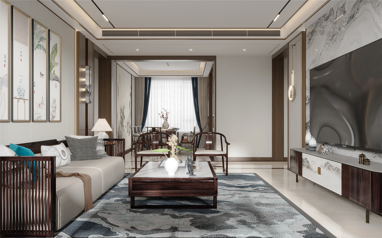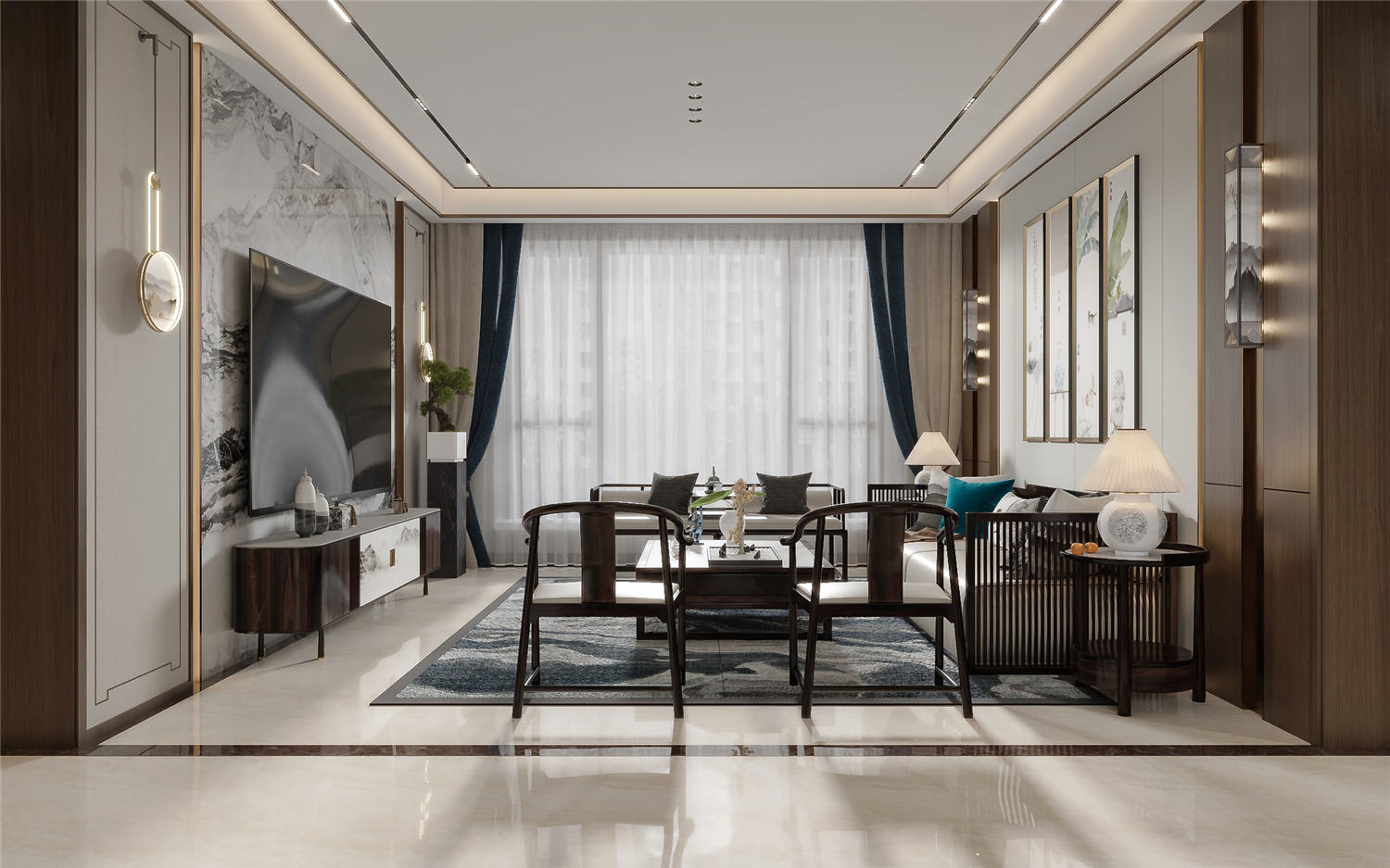 嵌入式的電視背景墻點綴上風格青花瓷花瓶,讓空間中流淌著優(yōu)雅古韻。