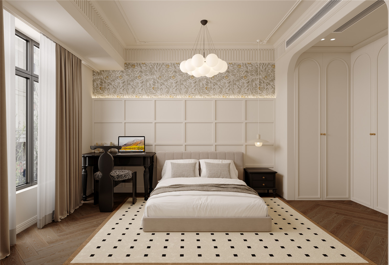 臥室區(qū)域使用了大面積的淺色作為主基調(diào)色,營造溫馨柔和氛圍,而撞色的床具則讓整個臥室更具個性感。