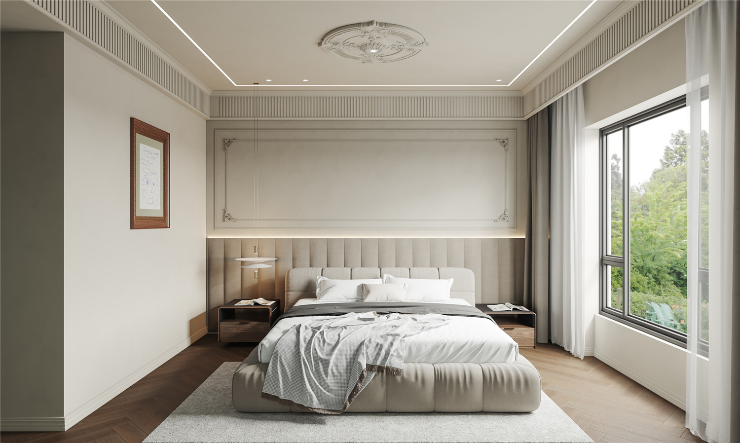 簡單的線條搭配耐看而又高級,窗簾與床具之間的顏色呼應則讓空間更具和諧美。