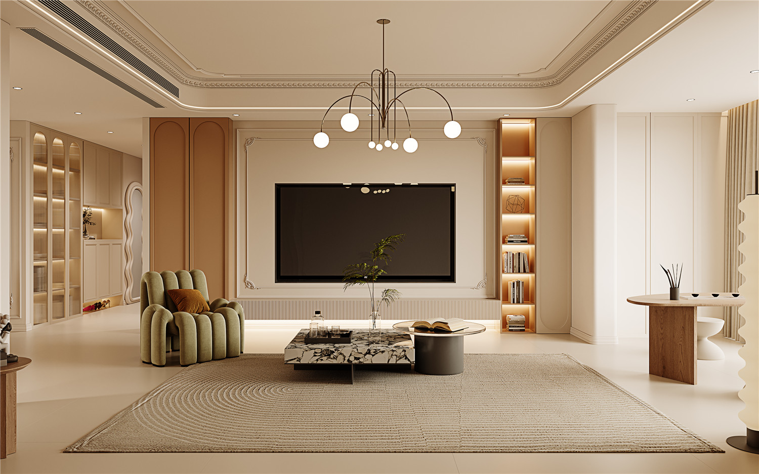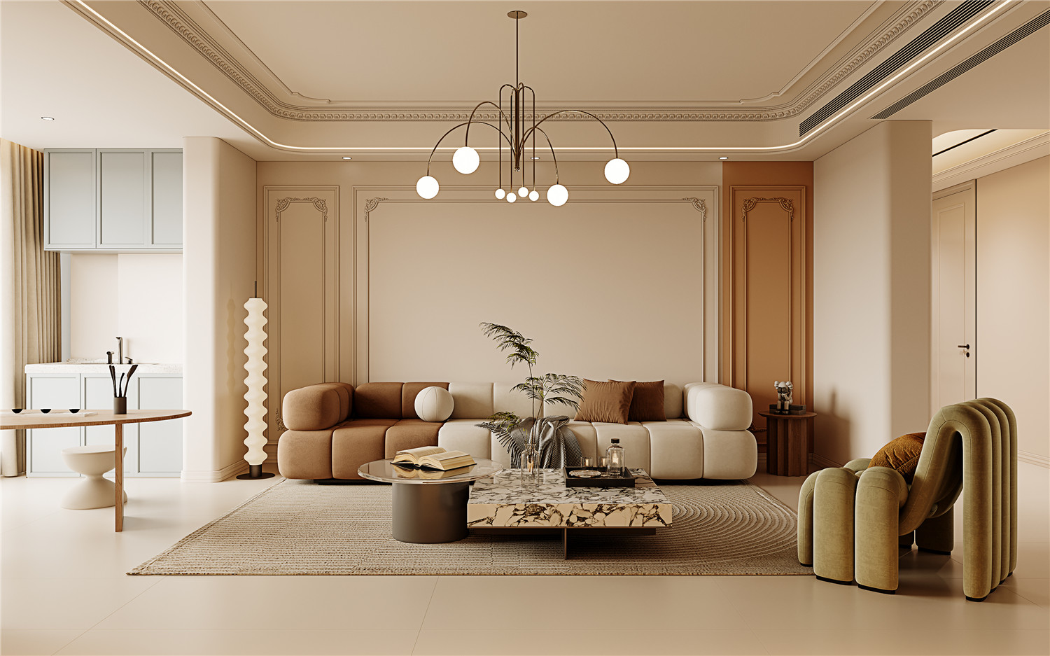 淡雅的奶油色在空間中悠然彌漫,輕柔地調和客廳的氛圍,使之更顯柔和與恬靜。墻面則巧妙地運用拼色設計,結合經典的法式雕花與流暢線條,勾勒出豐富而獨具匠心的紋理與層次,為整個空間增添了一抹優雅與精致的氣息。