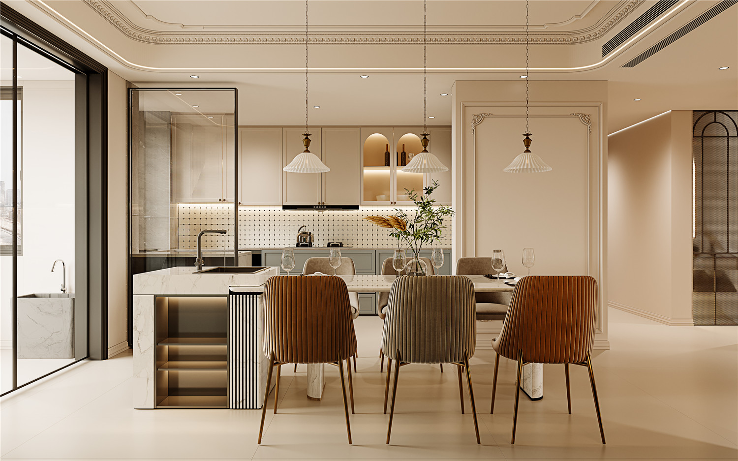 島臺旁,一列高挑的法式櫥柜展現著非凡的氣度,定制設計將恒溫酒柜、管線機完美嵌入,同時保留了充裕的收納空間,讓廚房用具井然有序。背景墻上,湖藍色瓷磚如同法式莊園中的靜謐湖泊,將用餐氛圍渲染得更為寧靜與優雅。