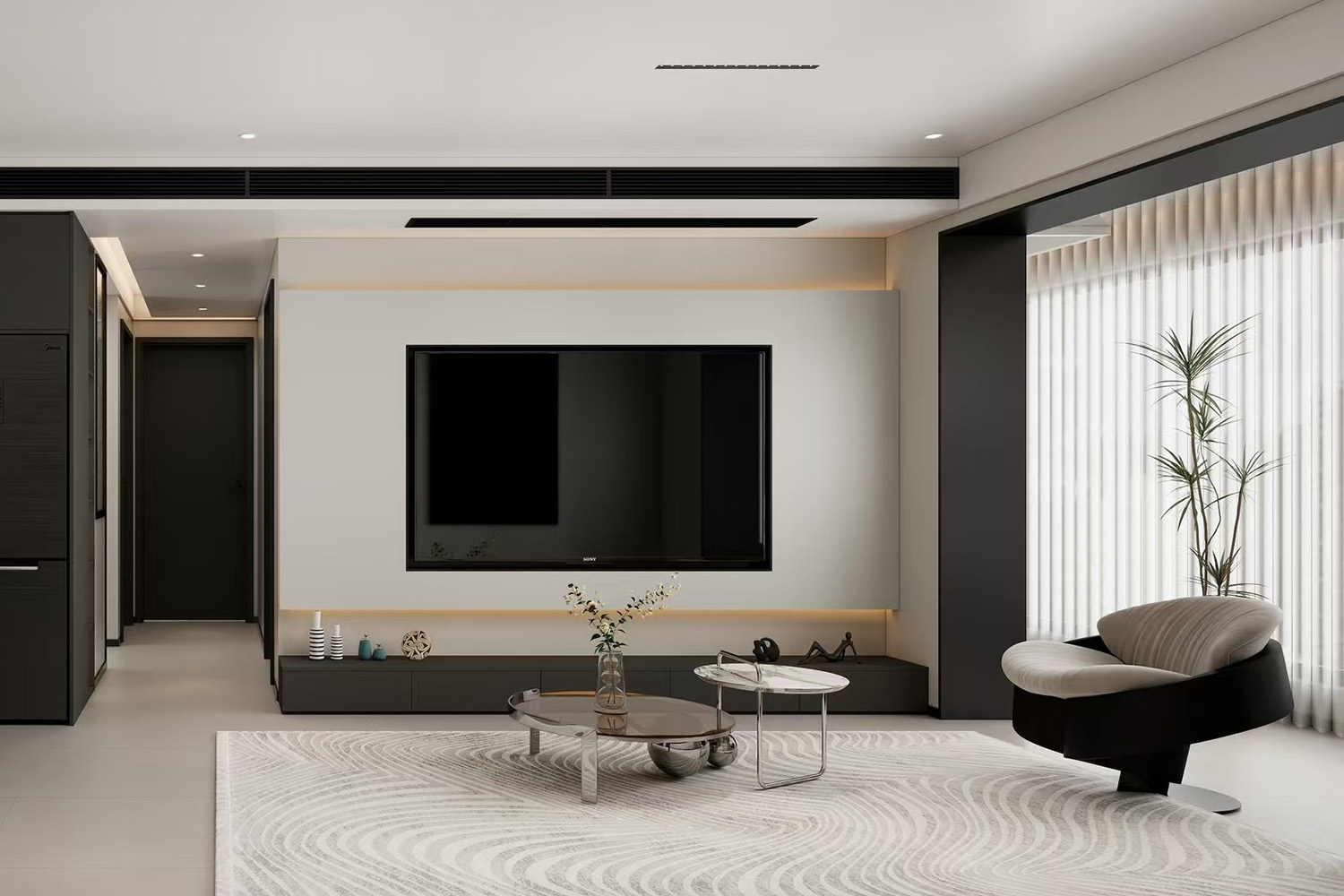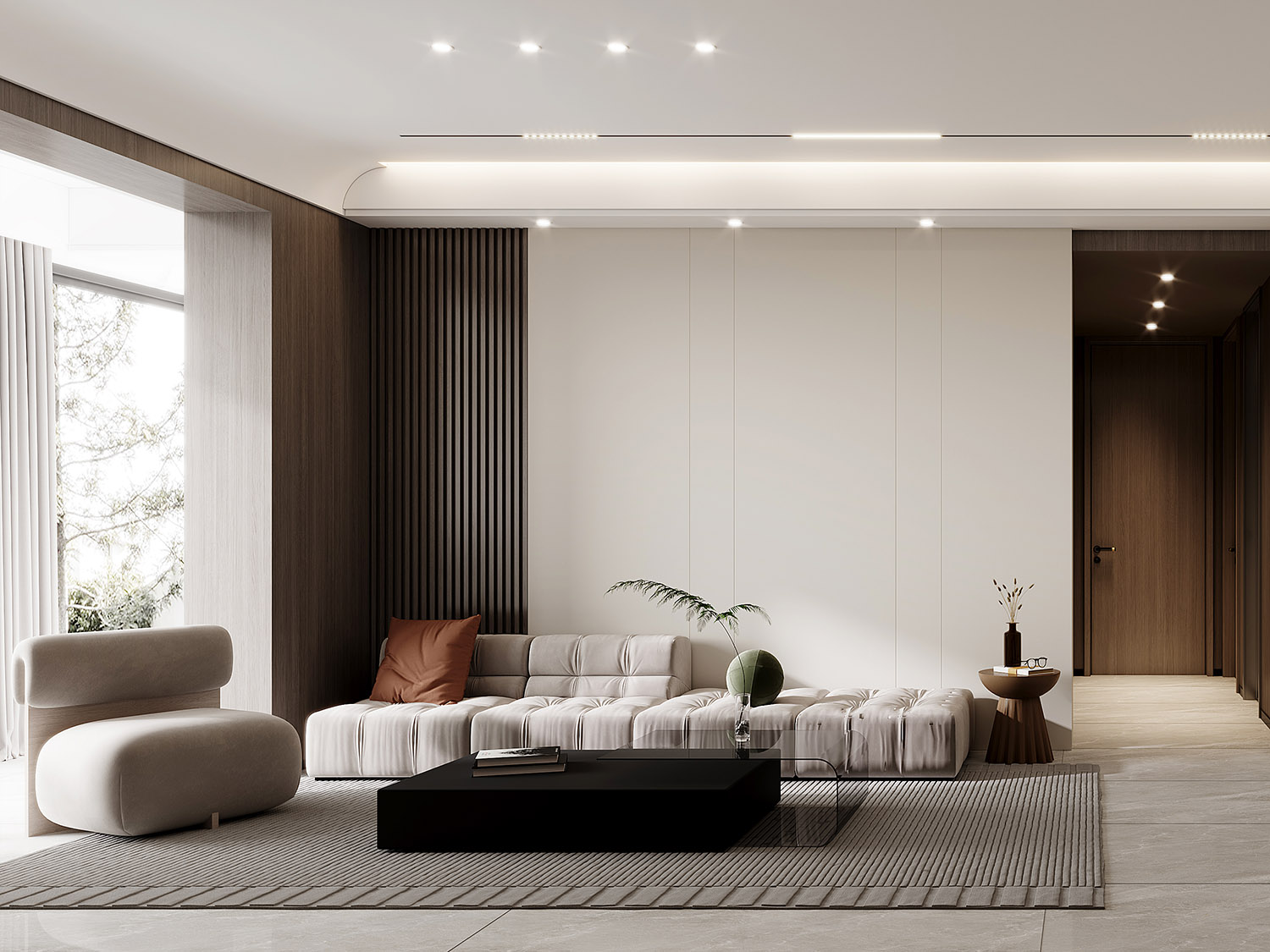 深褐色與灰色之間的碰撞,律動感十足的沙發混搭上線形背景墻,彰顯空間包容高雅格調。