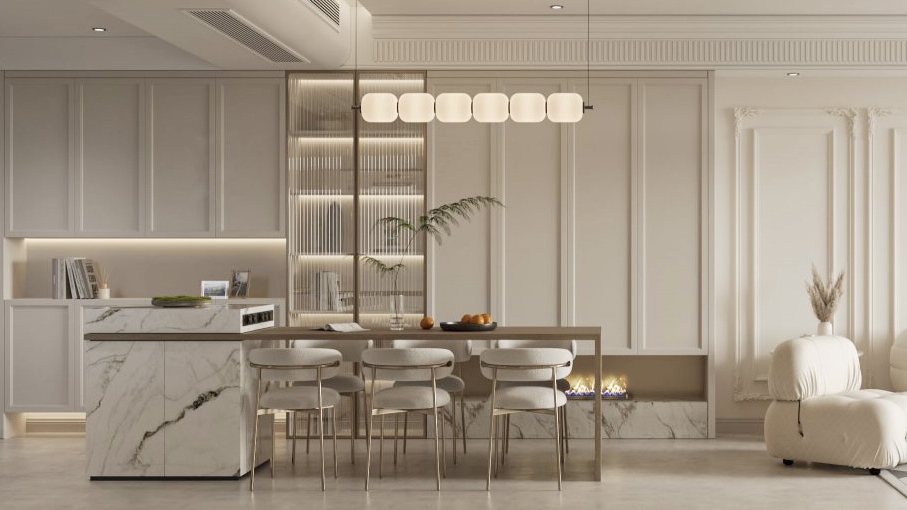 1 餐廳在提升視覺空間的同時,考慮充足存儲空間,并且打造了島臺,功能豐富多彩。