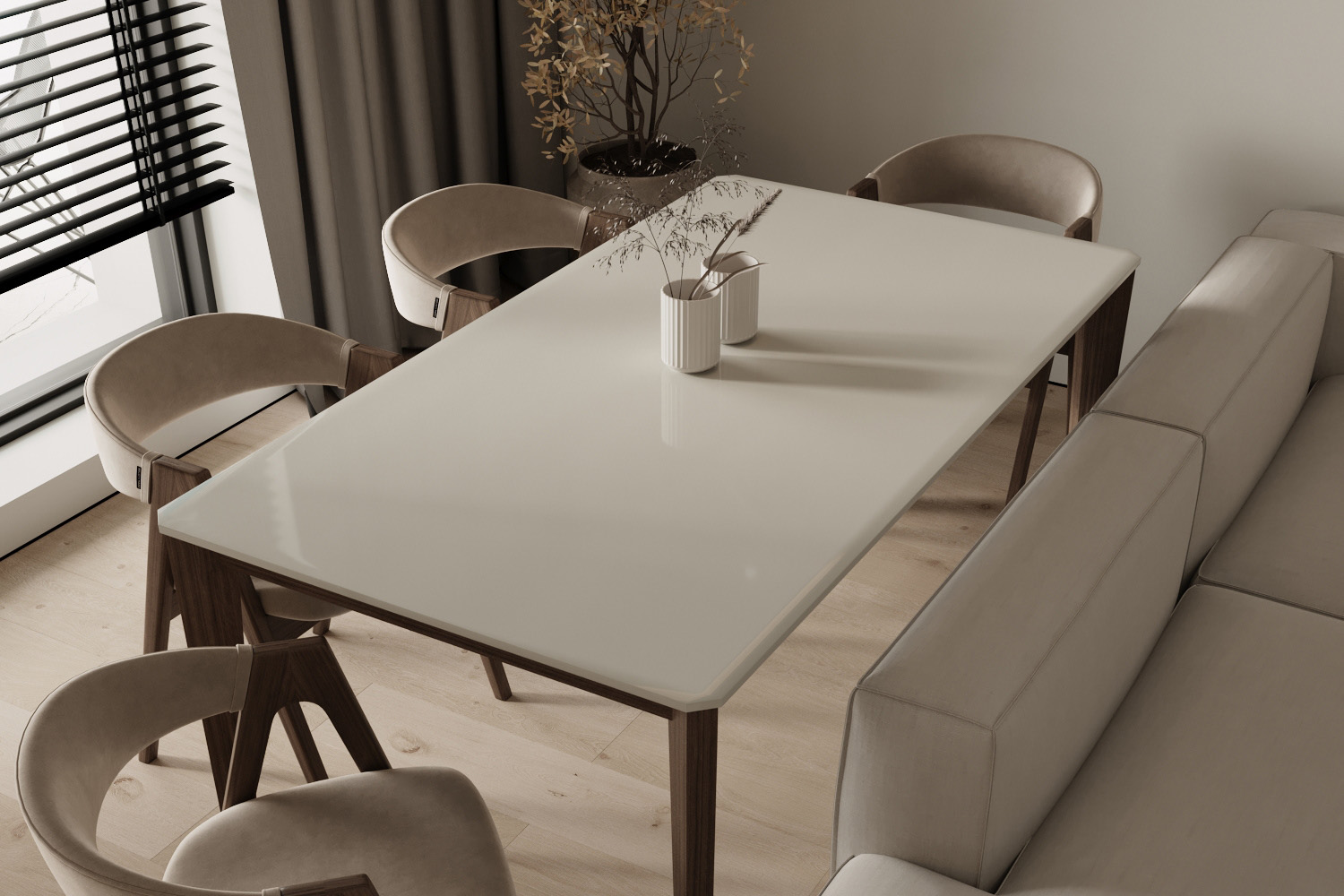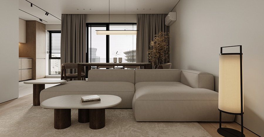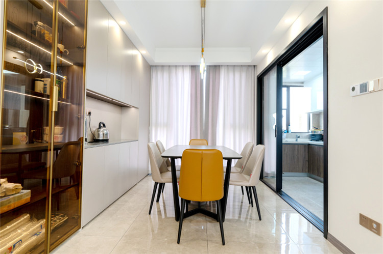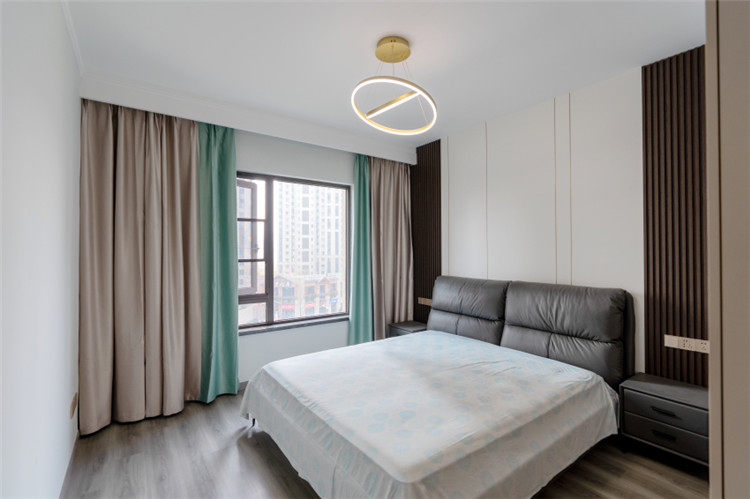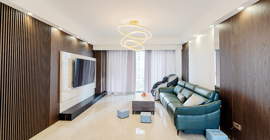 這套融創觀瀾府的四居室房屋建筑面積在143㎡左右,房屋的結構已經有了雛形,且業主為了節約裝修花銷,提議設計師在原有的戶型結構上進行裝修設計。因此設計師保留了原有的功能結構,同時借助色彩、材質等軟裝元素為房屋進行“包裝”,以保障裝修效果。同時,為提升空間質感,設計師選用了大量“隱形”設計,如材質本身的紋理等,以起到在無形中裝飾空間的作用。