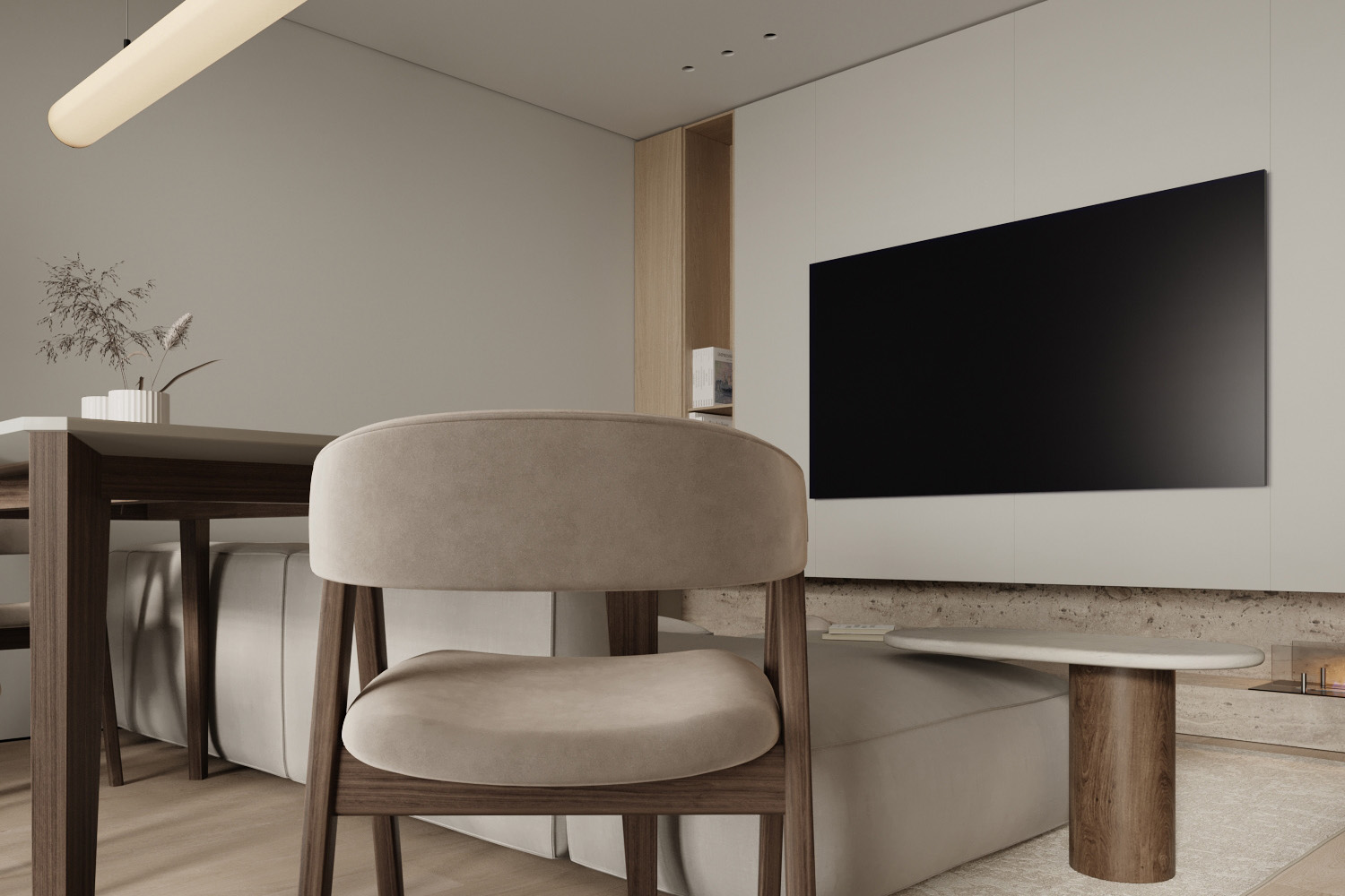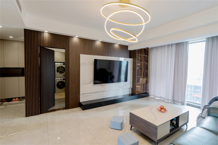 借用隱形門作為電視背景墻,藝術感十足而又有效提升了藝術墻面的利用度。