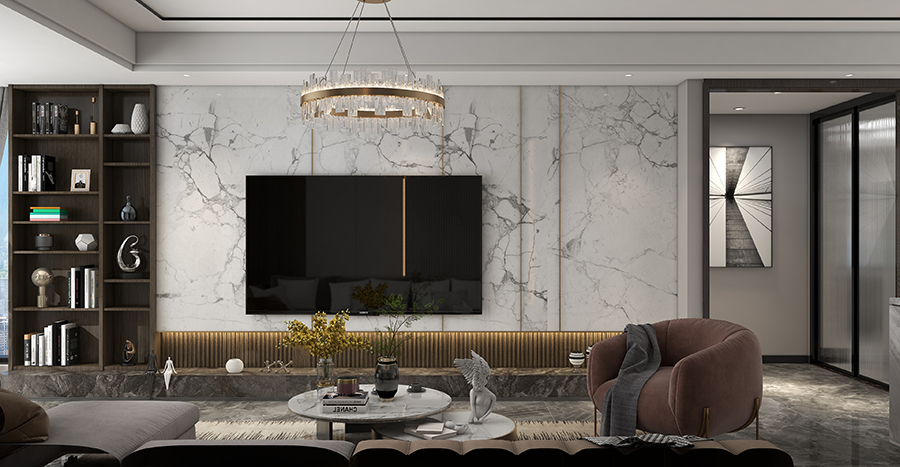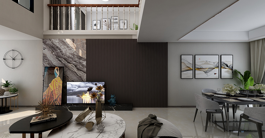案例簡介:本案設計以線色調為主,線性燈點綴面,胡桃木的穩重色調進行搭配。沙發、燈具及軟裝的陳設,充分展現通透空間的所派感。以縱向穿插呈現空間的力度之美,展示美學點、線、面的特點之美,模糊空間界線、材質界線,造就層次流轉的界面語匯,盡顯空間魅力。作為新人的婚房而言,完全符合了現代人的審美需要。