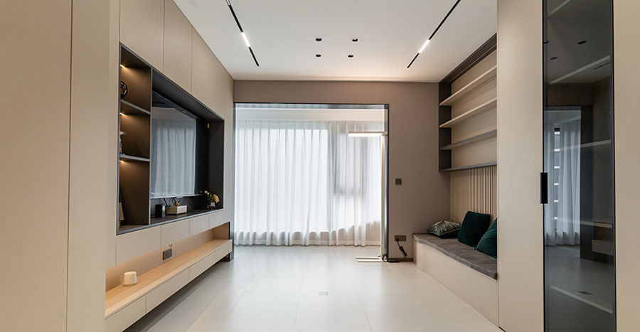 灰色線條的設計和灰色的沙發相映成章,客廳內的書柜彰顯了家庭的文化氛圍。